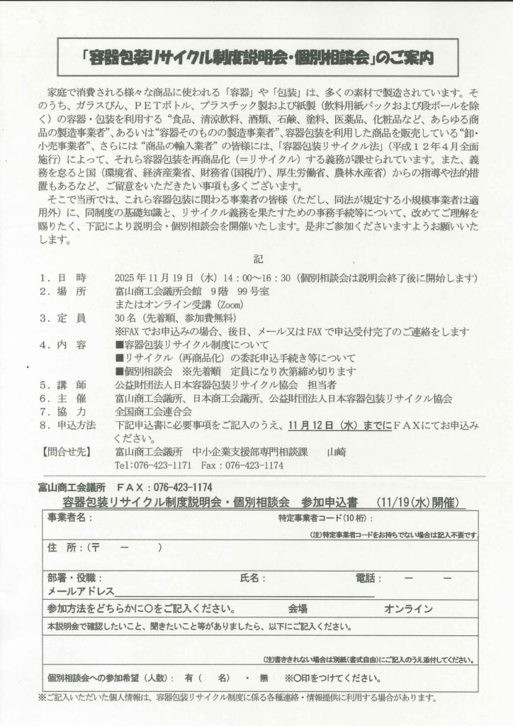 富山商工会議所では容器包装に関わる事業者の皆様(ただし「容器包装リサイクル法」が規定する小規模事業者は適用外)に対し、同制度の基礎知識とリサイクル義務を果たすための事務手続等について、改めてご理解を賜りたく、説明会・個別相談会が開催されます。