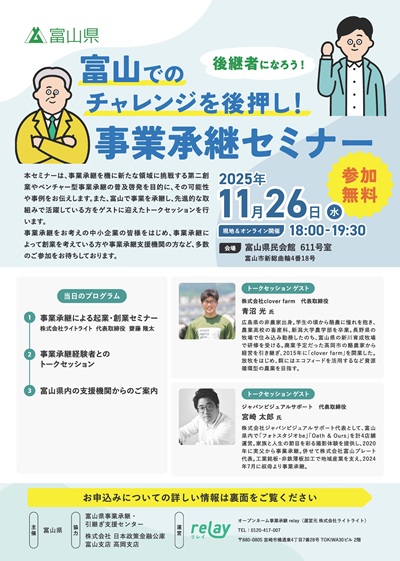 事業承継のより一層の推進に向けて、富山県主催で事業承継セミナーが開催されます。