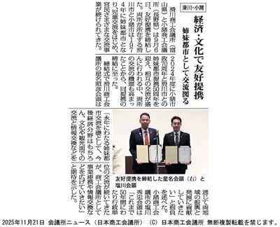 9月6日(土)に当所創立70周年記念祝賀会において、長野県 小諸商工会議所と「友好商工会議所提携」を締結いたしましたが、この件が日本商工会議所「会議所ニュース(2025年11月21日発行)」に掲載され、全国515商工会議所に紹介されました。