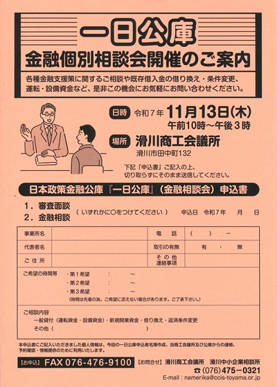 滑川商工会議所では、日本政策金融公庫と連携し、「一日公庫」を開催いたします。