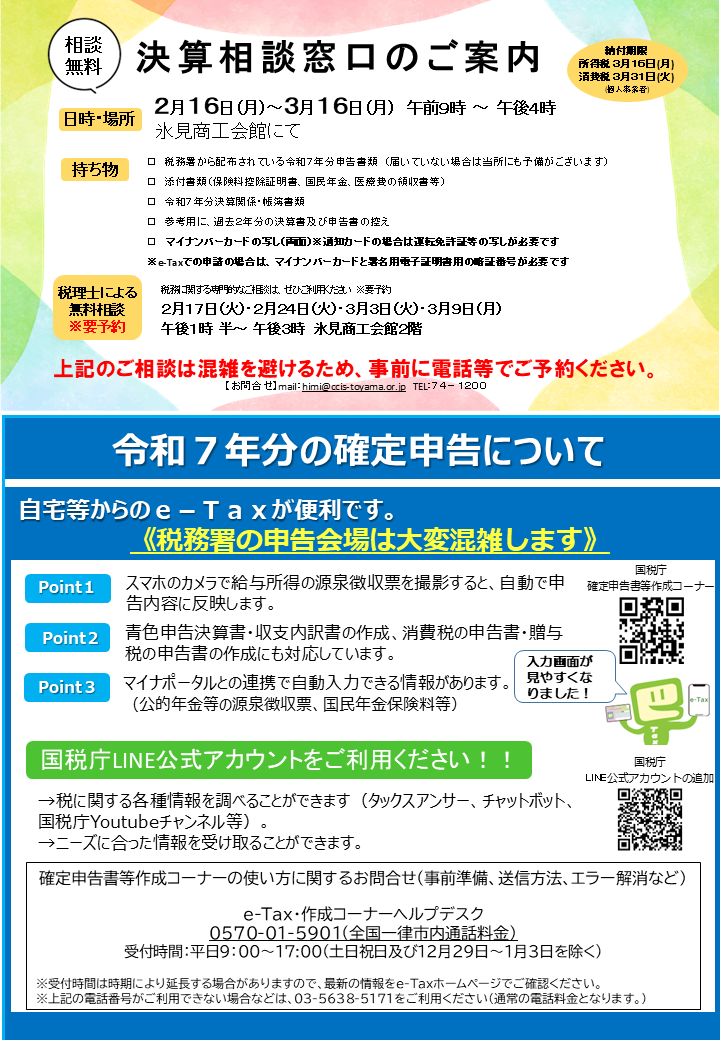 TEL 0766-74-1200 FAX 0766-74-3511 フリーダイヤル 0120-134-066 MAIL himi@ccis-toyama.or.jp ◆氷見商工会議所は健康経営に 取り組むことを宣言します
