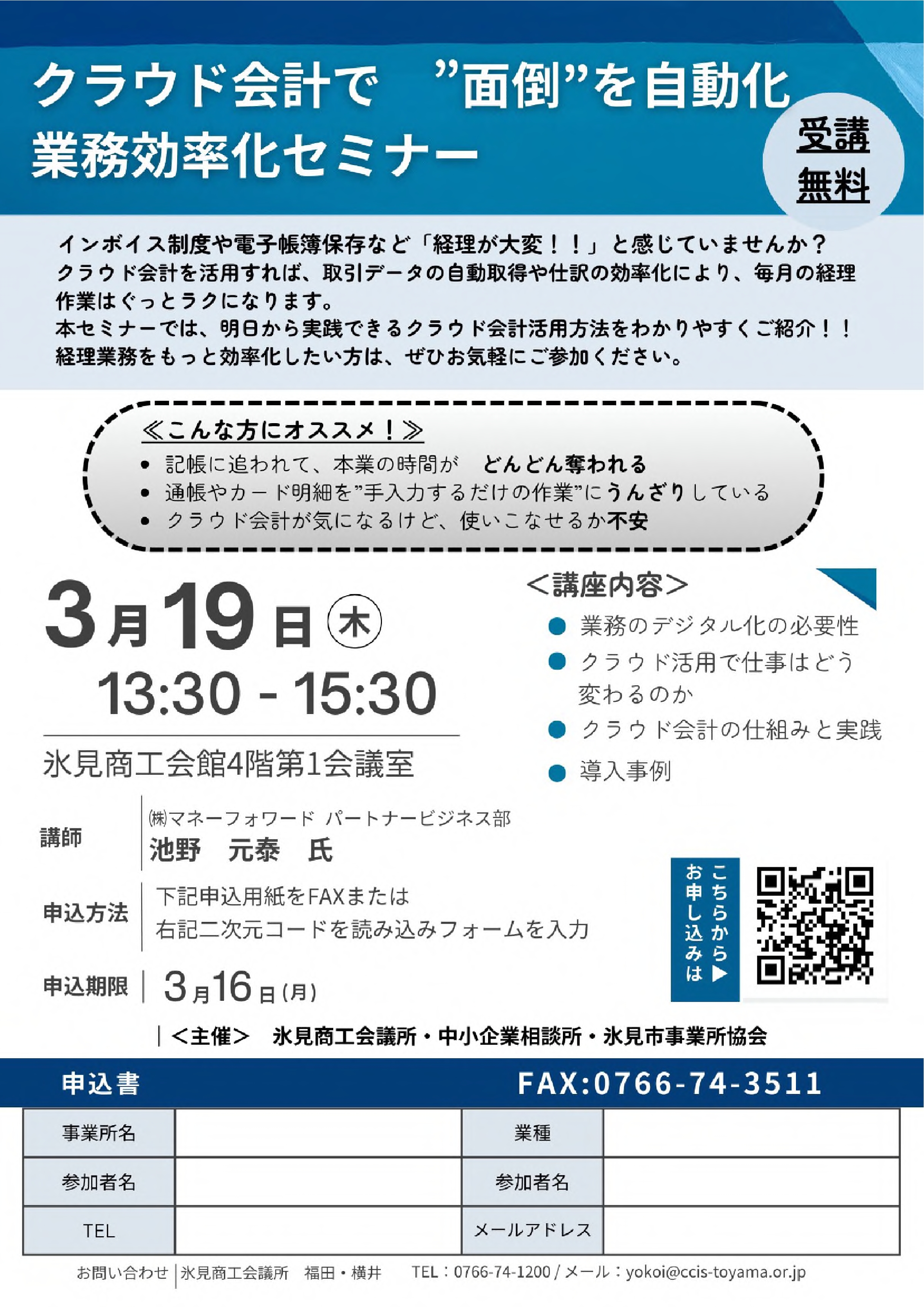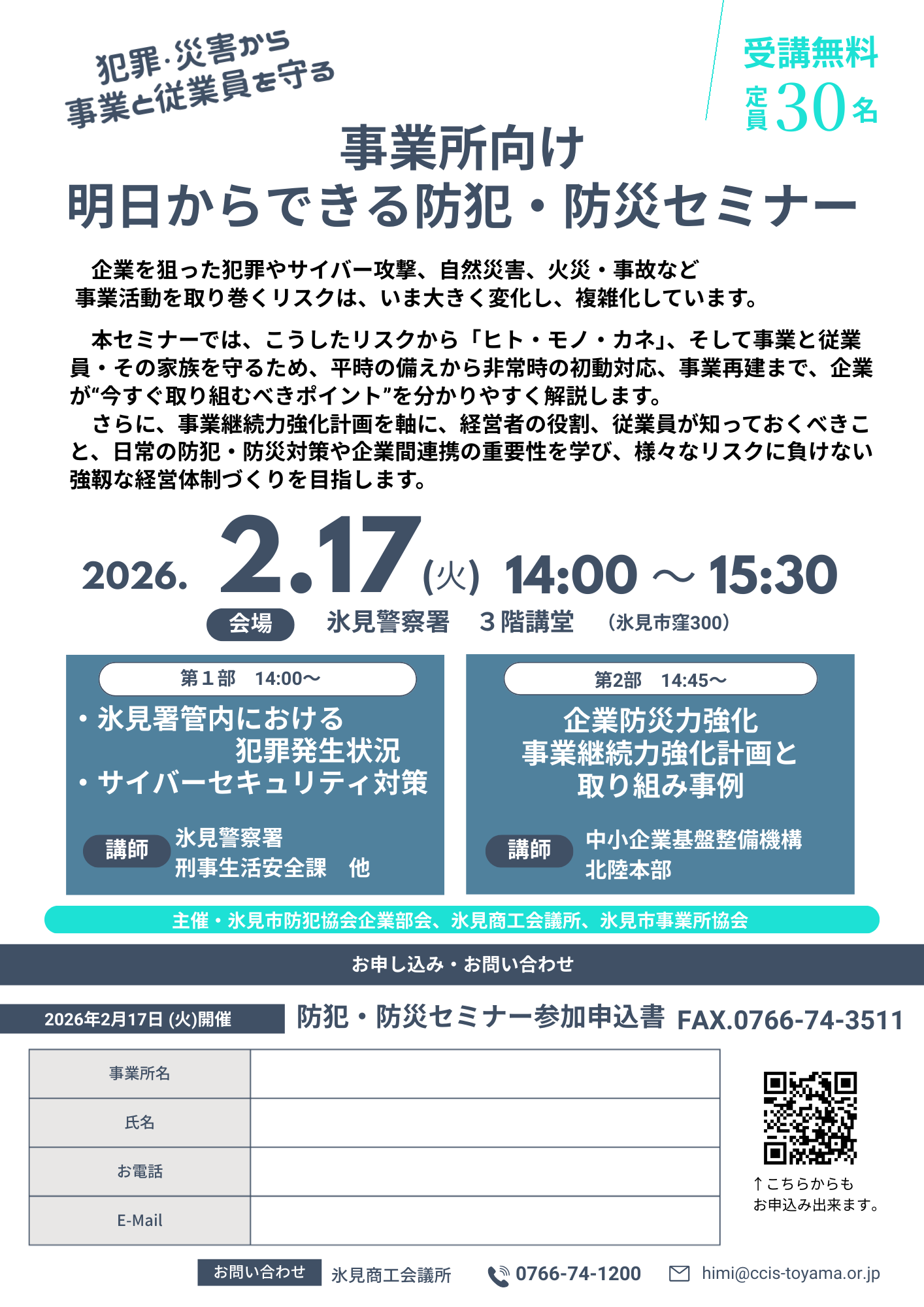 TEL 0766-74-1200 FAX 0766-74-3511 フリーダイヤル 0120-134-066 MAIL himi@ccis-toyama.or.jp ◆氷見商工会議所は健康経営に 取り組むことを宣言します