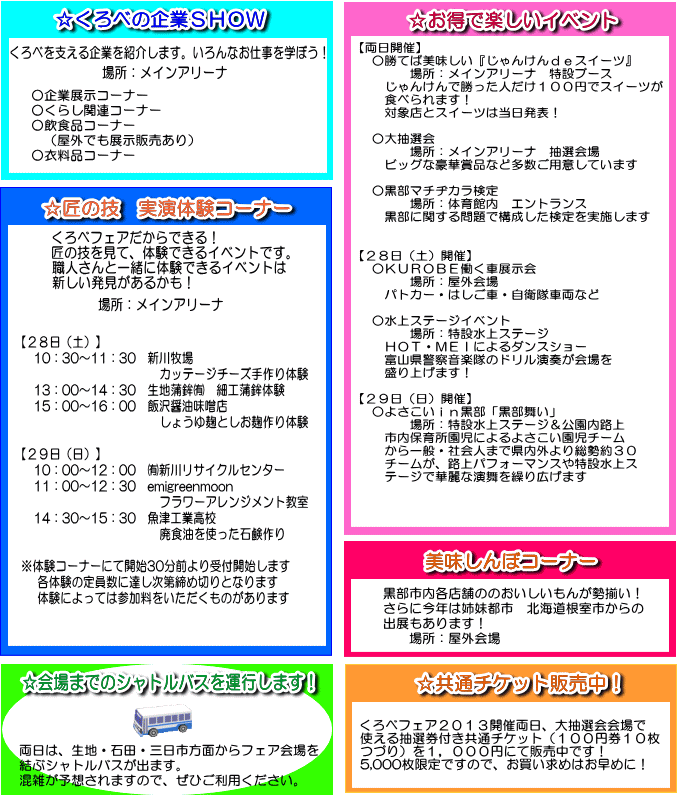 この他にもさまざまなイベントを予定しております。詳しくはくろべフェア実行委員会事務局(黒部商工会議所内 ☎(0765)52-0242まで