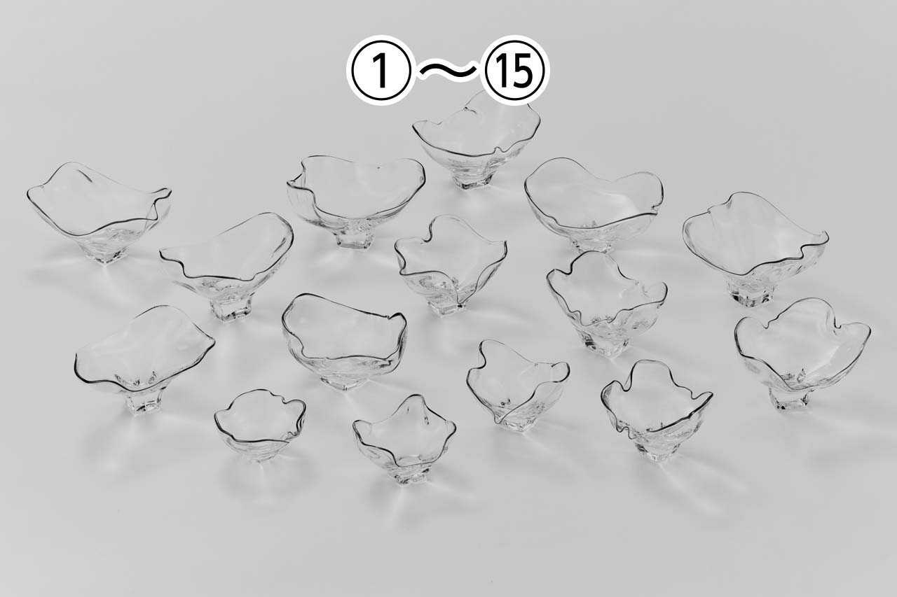 ①〜④:約10×10×7㎝、⑤〜⑨:約13×11×8㎝、⑩〜⑮:約14×13×10㎝
