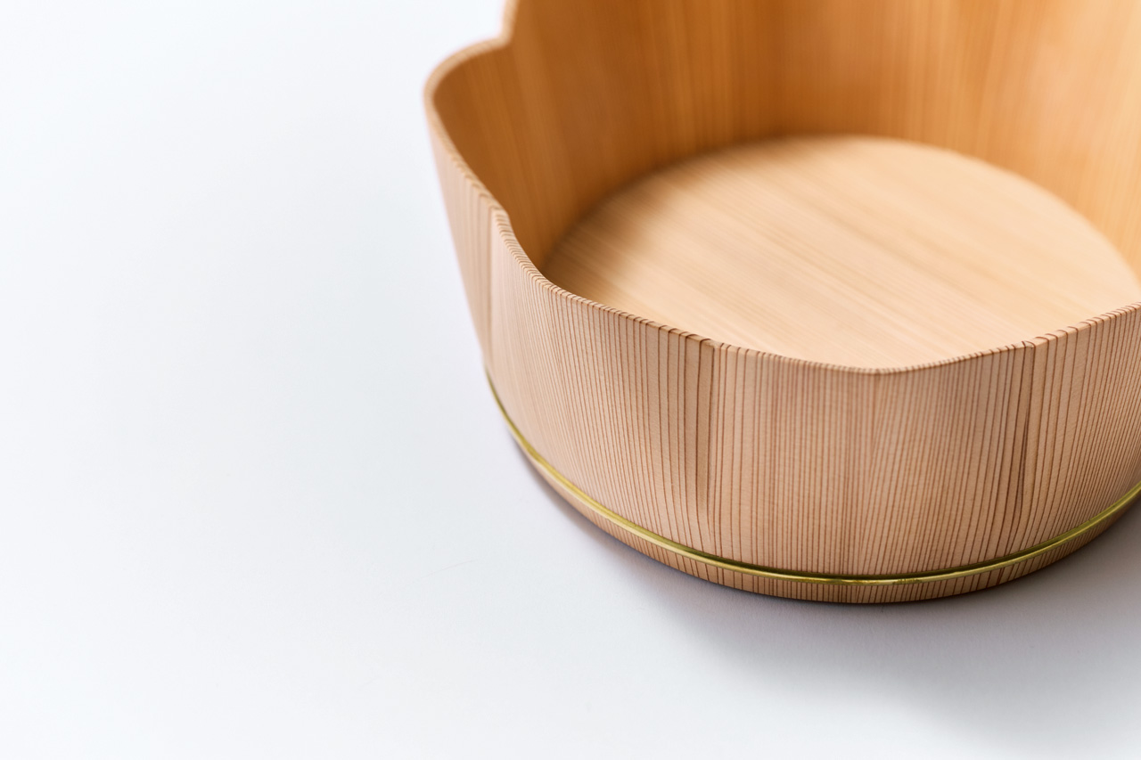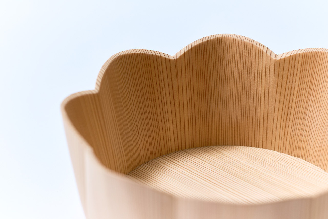 現代では使われることが少なくなった「木桶」の技術を用いて器を制作しました。木桶の新しいカタチを日々模索している中、木の温かみをより感じることができるよう、やわらかい雰囲気を目指し8枚の花弁をイメージした形にしました。ハレの卓を彩る一助になれば幸いです。