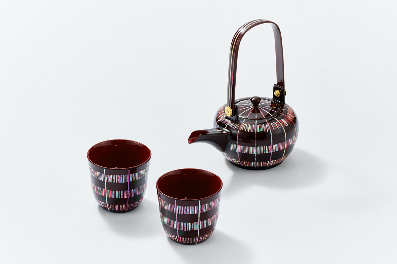 銚子:木製(栃材)、本漆、アワビ貝 カップ:木製(栃材)、本漆、アワビ貝