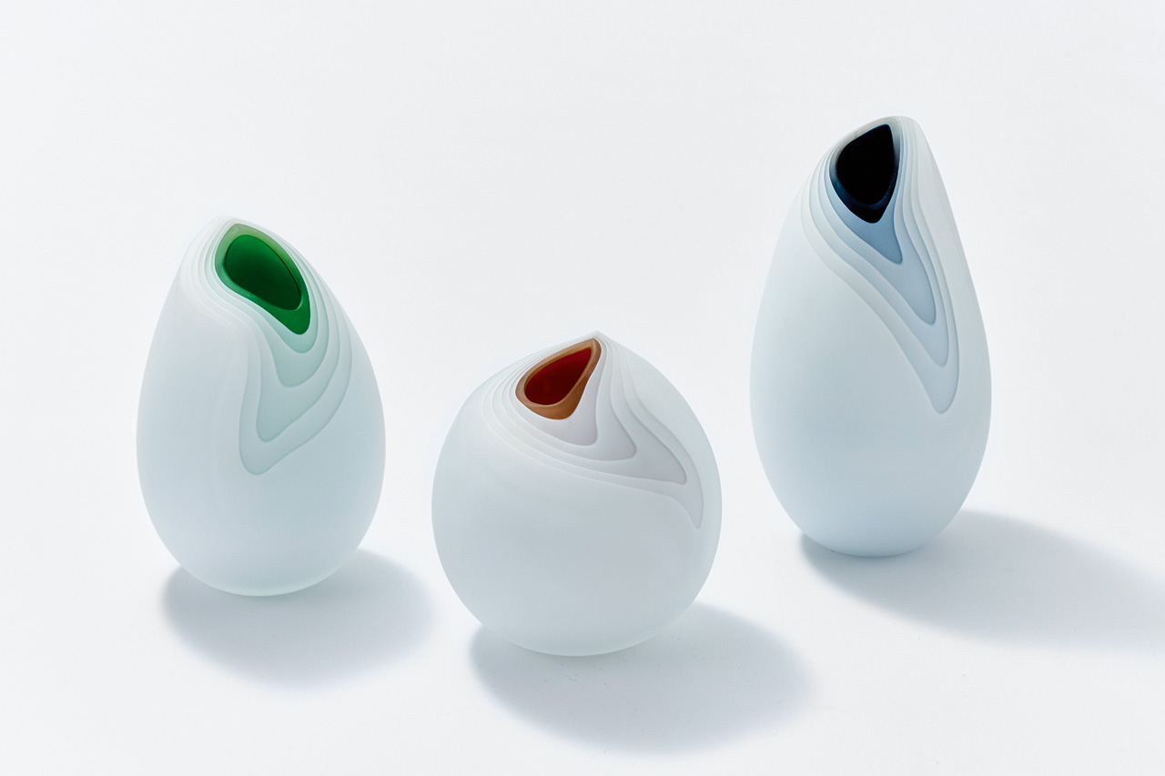 2025年 ガラス MAYU 花器 ガラス ①:9×9×19㎝、②:10×10×16㎝、③:12×12×13㎝ ①〜③:各¥132,000 川辺 雅規 カワナベ マサキ 島根県 表示価格はすべて税込です。