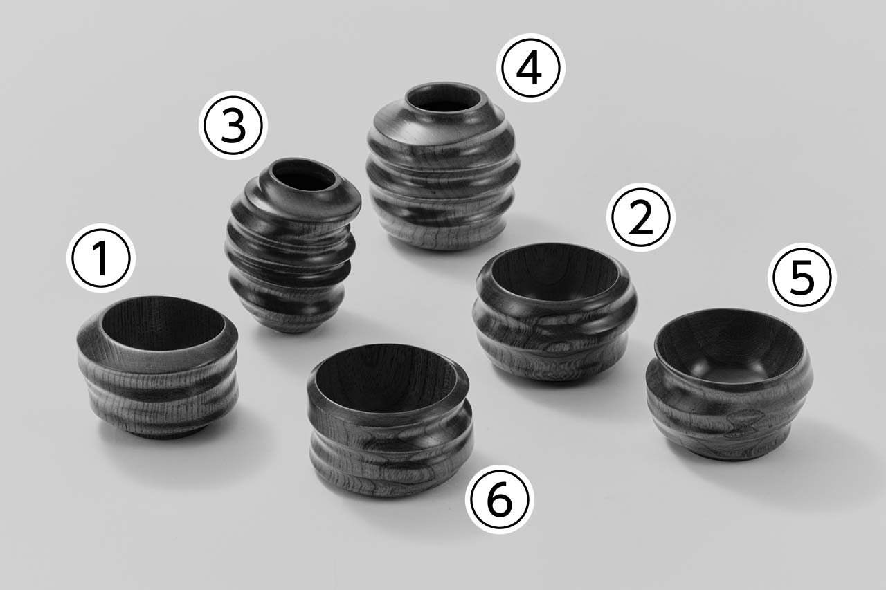 ①・②・⑤・⑥:9×7.5×7.5㎝ 約100mL、③・④:8×9×9㎝ 約130mL