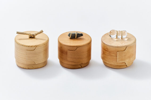 ①:檜、ウォルナット、紐、鉄、磁石、ガラス ②:チェリー、ウォルナット、栗、アルミなど