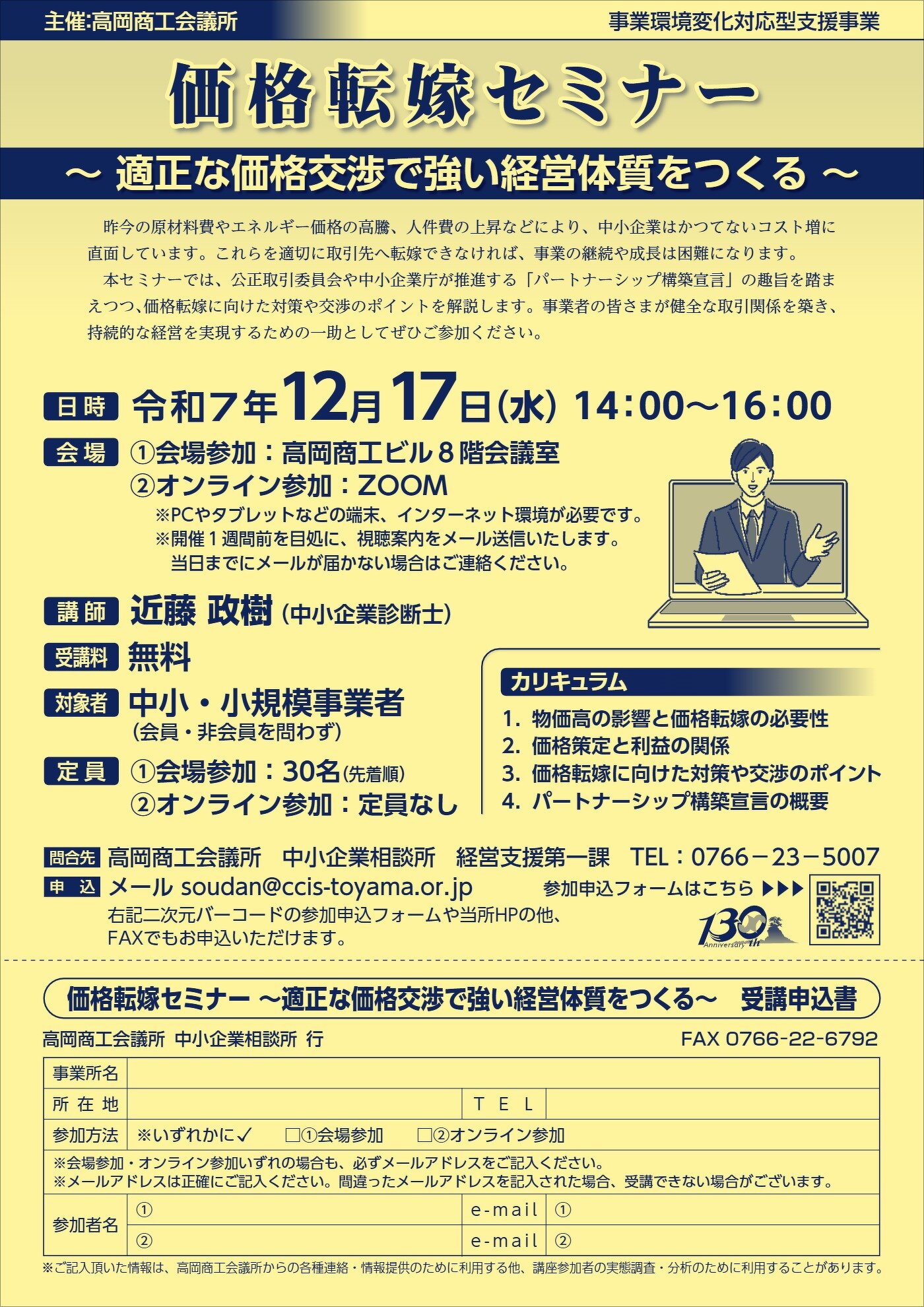 - ①会場参加:30名(先着順) ②オンライン参加:定員なし