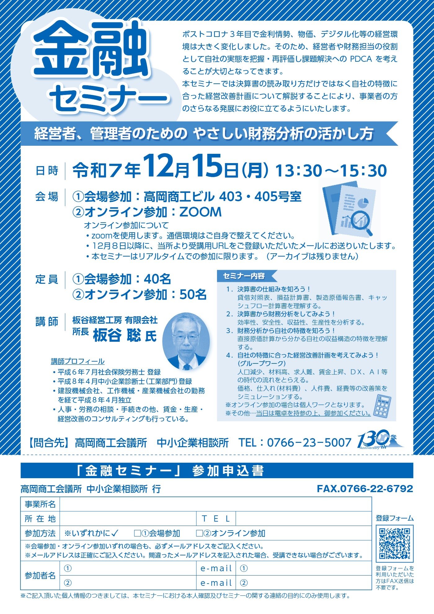 【12月15日開催】金融セミナー「経営者、管理者のためのやさしい財務分析の活かし方」参加者募集